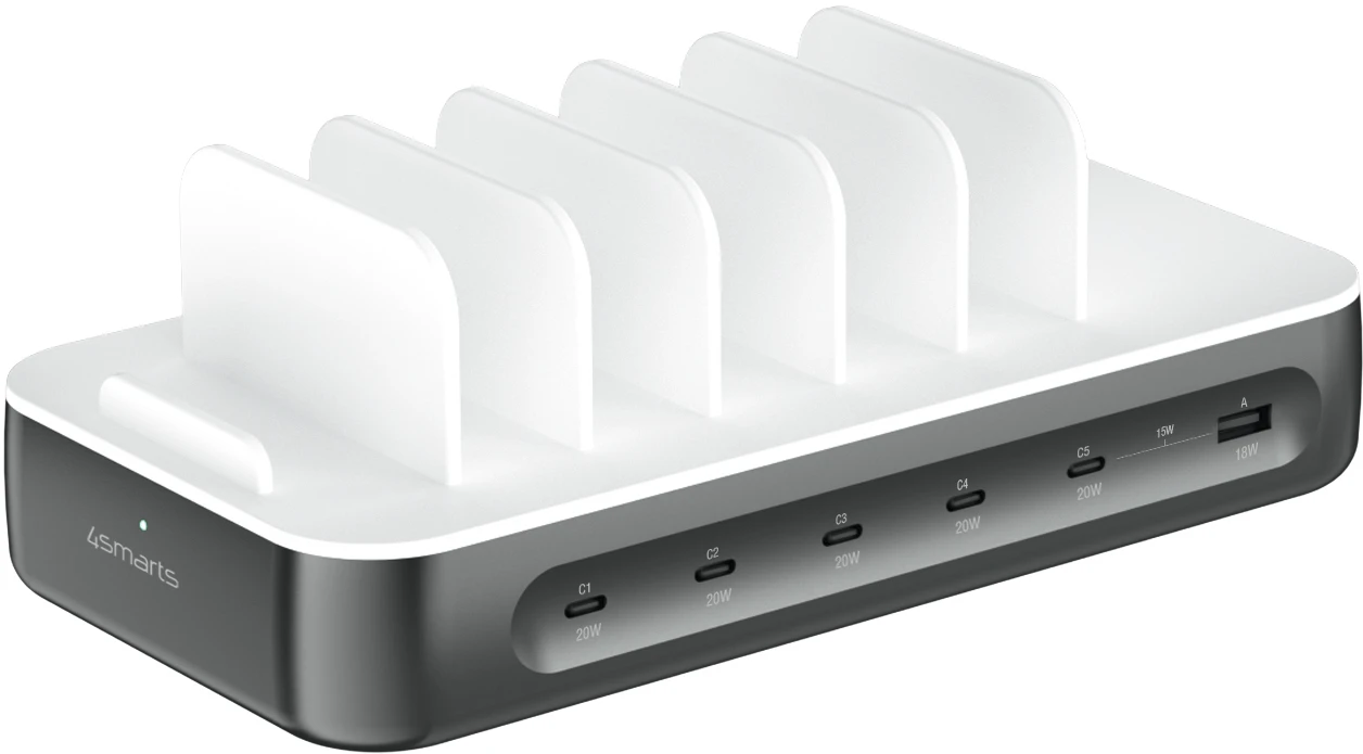 Die 4smarts Ladestation Team ist die ideale Lösung für alle, die viele Geräte gleichzeitig und organisiert laden möchten – ob zu Hause, im Büro, im Vereinsheim oder unterwegs. Mit insgesamt sechs Anschlüssen (5x USB-C, 1x USB-A) und dem innovativen 4in1-Multiladekabel können bis zu neun Geräte gleichzeitig geladen werden. Dank der Unterstützung für USB-C, Lightning und Micro-USB ist sie kompatibel mit einer Vielzahl an Smartphones, Tablets und weiteren Geräten vom VR-Headset bis hin zu E-Zigaretten wie z.B. der IQOS – von aktuellen Modellen bis hin zu älteren Ausführungen. Eine praktische USB-Ladestation für mehrere Geräte, die für alle Einsatzzwecke geeignet ist.